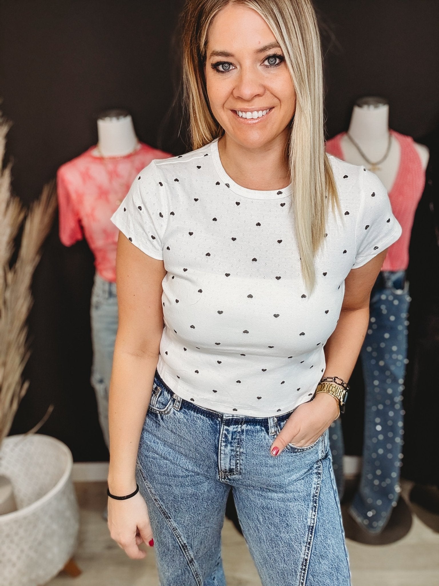 Adorable mini hearts dance across this cozy baby tee, perfect for little ones who love sweet style. Crafted with a true fit that flatters and gentle stretch for all-day comfort, this tee moves with your baby through playtime and cuddles. The classic black heart print adds charm to any outfit, making it an easy go-to piece for everyday wear.
