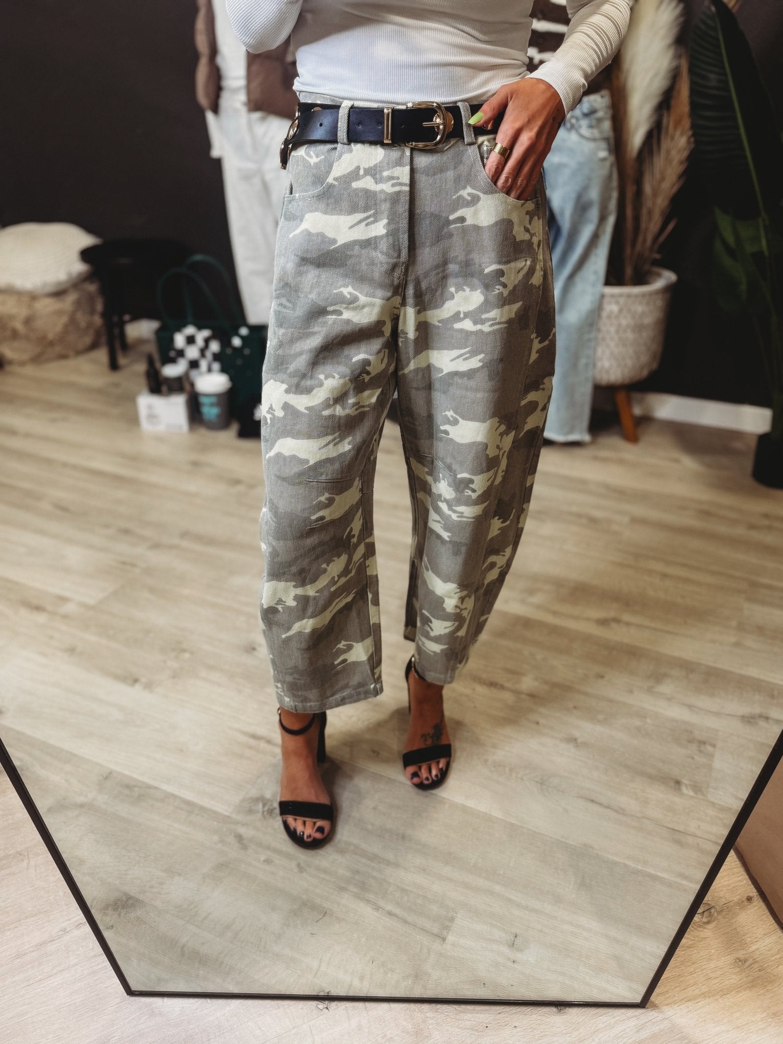 Stay ahead of the style game with these Aria Camo Barrel Jeans. The bold camo print meets a relaxed barrel-leg fit, making them the perfect mix of edgy and effortless. Whether you’re dressing up or keeping it casual, these jeans add a playful twist to any outfit. Comfortable, cool, and totally on trend—your new wardrobe favorite has arrived.