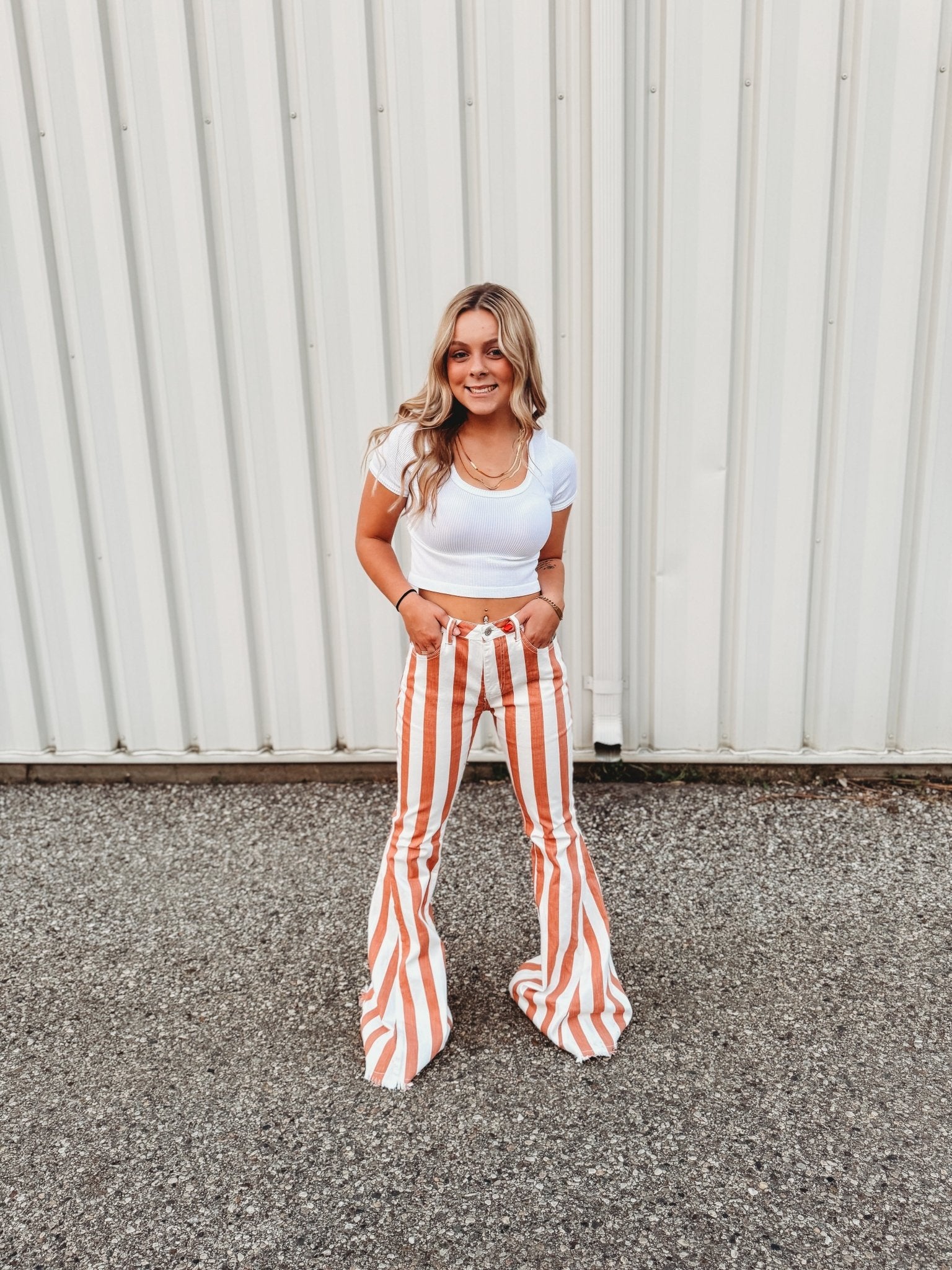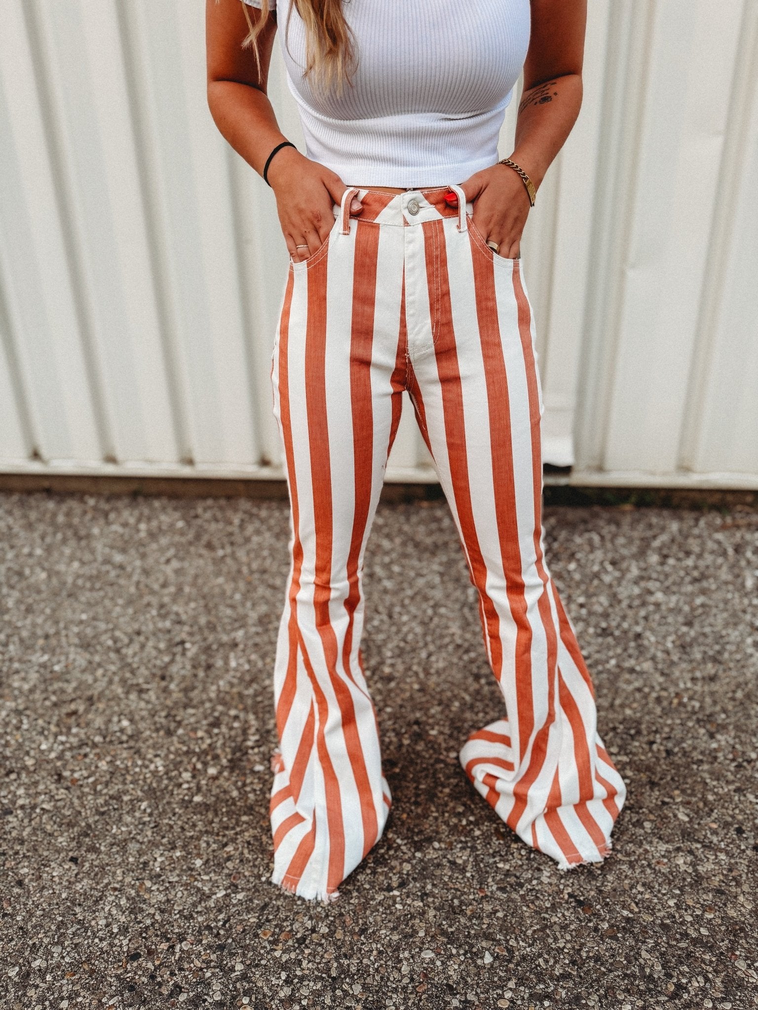 Step into the wild west with the Ashton Striped Flare Denim! These playful jeans bring a fresh twist to classic flare styles, featuring bold stripes that add a dash of fun to your look. Perfect for dancing under the stars or casual days in town, they combine comfort and flair for a truly standout outfit. Embrace your inner cowgirl with a modern edge!