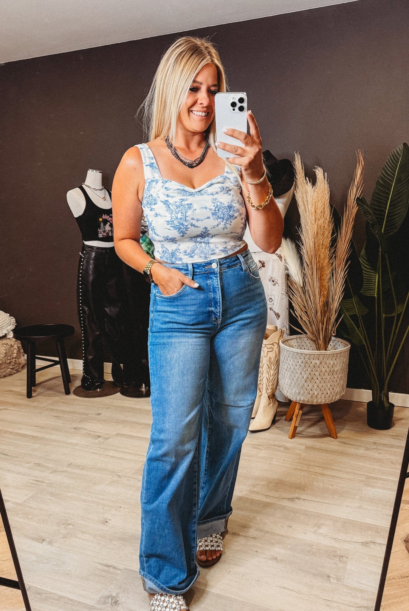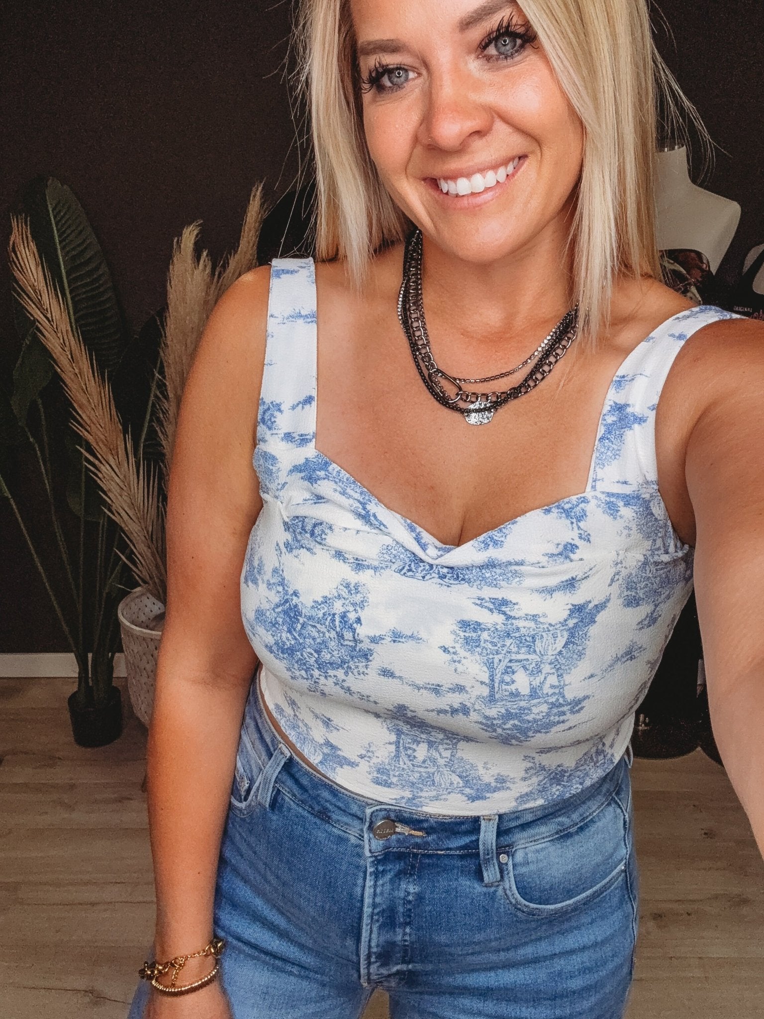 Embrace sunny days in the Blakely Floral Sweetheart Neck Tank Top, featuring gorgeous shades of blue that brighten your look. Its flirty sweetheart neckline adds a playful touch, perfect for effortless summer style. Lightweight and breezy, this tank keeps you cool while turning heads wherever you go.