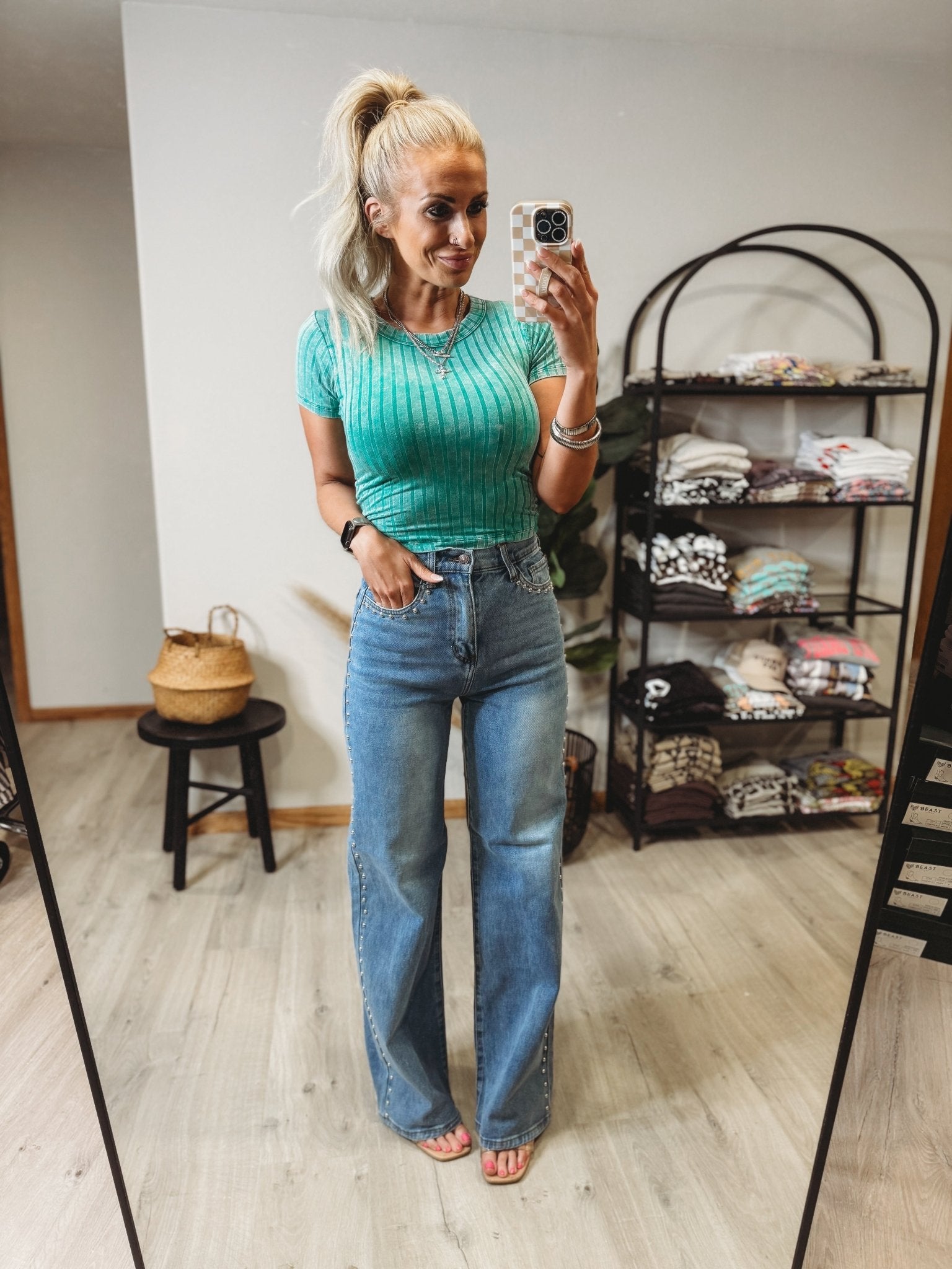 Introducing our Blakely Studded Jeans - the perfect mix of high rise comfort and eye-catching style! These jeans will elevate any outfit with their gorgeous bling detail, making you the talk of the town. Get ready to turn heads and make a statement with these must-have jeans!