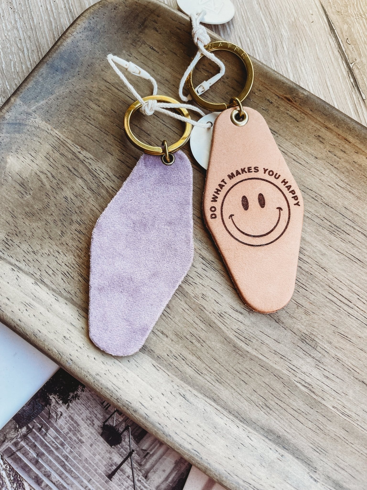 Add some playful flair to your daily routine with our Do What Makes You Happy Keychain! The leather front and velvet colored back add a touch of luxury to your keys, while the gold keyring ensures your keys stay secure. Available in 2 vibrant colors. (Go ahead, let a little happiness dangle from your keyring)!