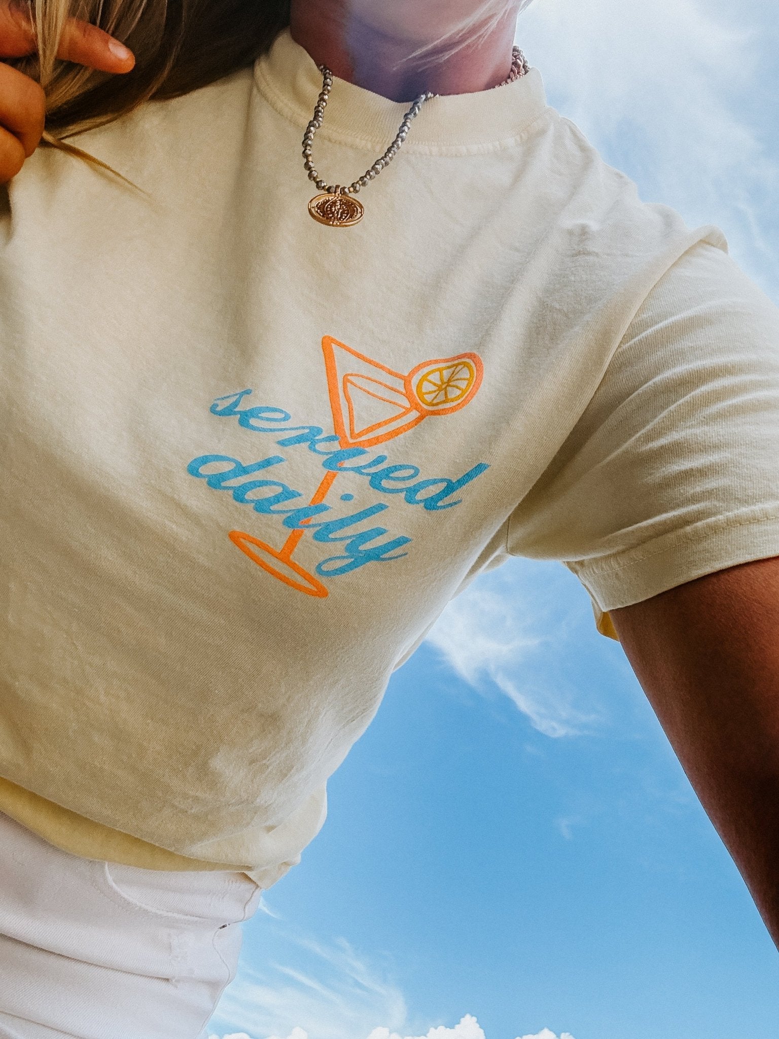 At our Lake Club, the docktails are served daily! Ice cold and ready for a good time! Please lake responsibly! This butter yellow Comfort Colors tee features a front and back graphic in the most summer color combo of orange and blue. We love the garnished martini glasses!