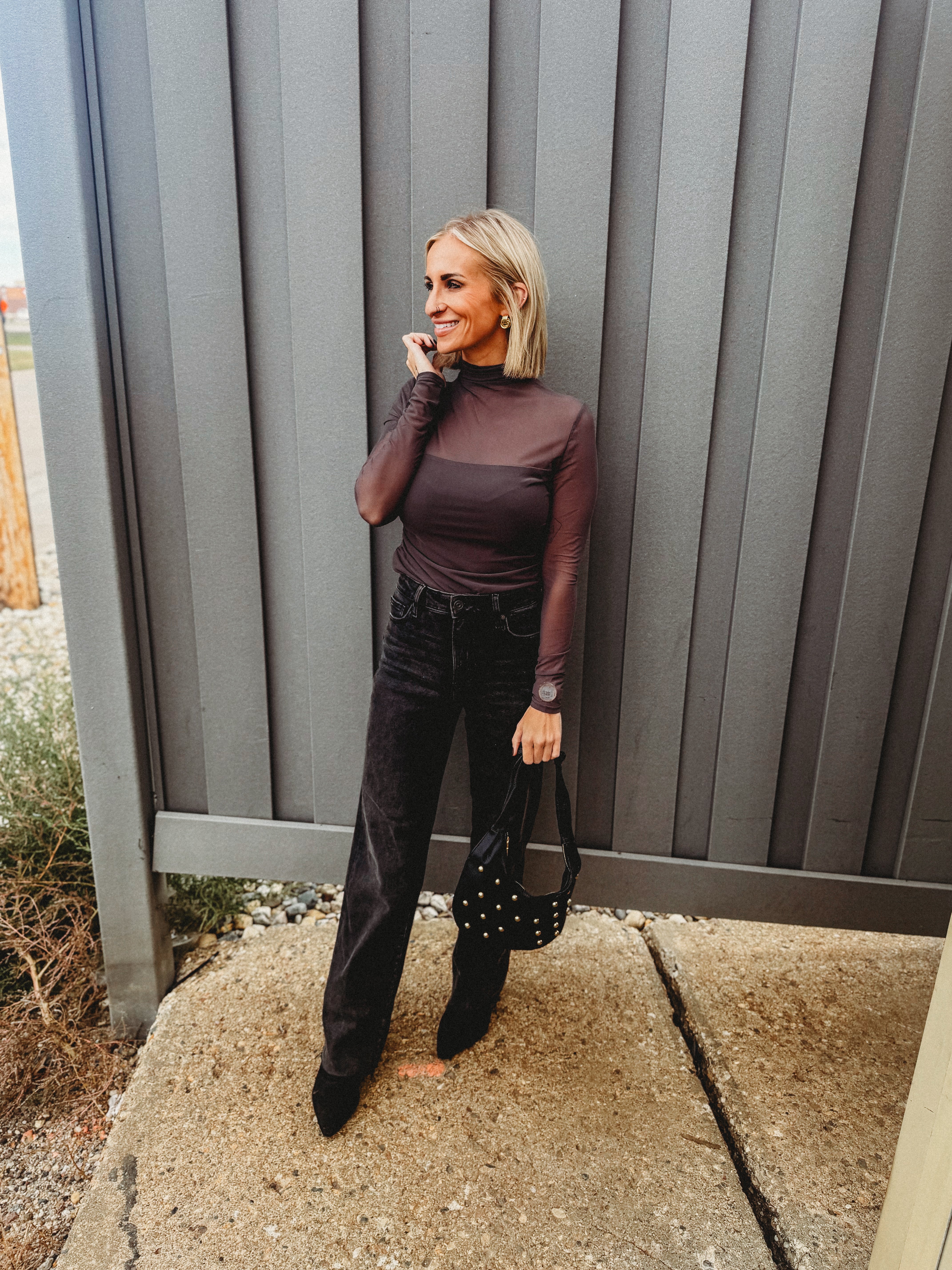 Turn heads on your next girls’ night out or a flirty date night with the Georgia Sheer Mock Neck Top. Its delicate sheer fabric and sleek mock neck add just the right touch of sophistication while keeping things playfully sexy. Pair it with your favorite skirt or jeans to effortlessly elevate your look and sparkle with confidence all evening long.