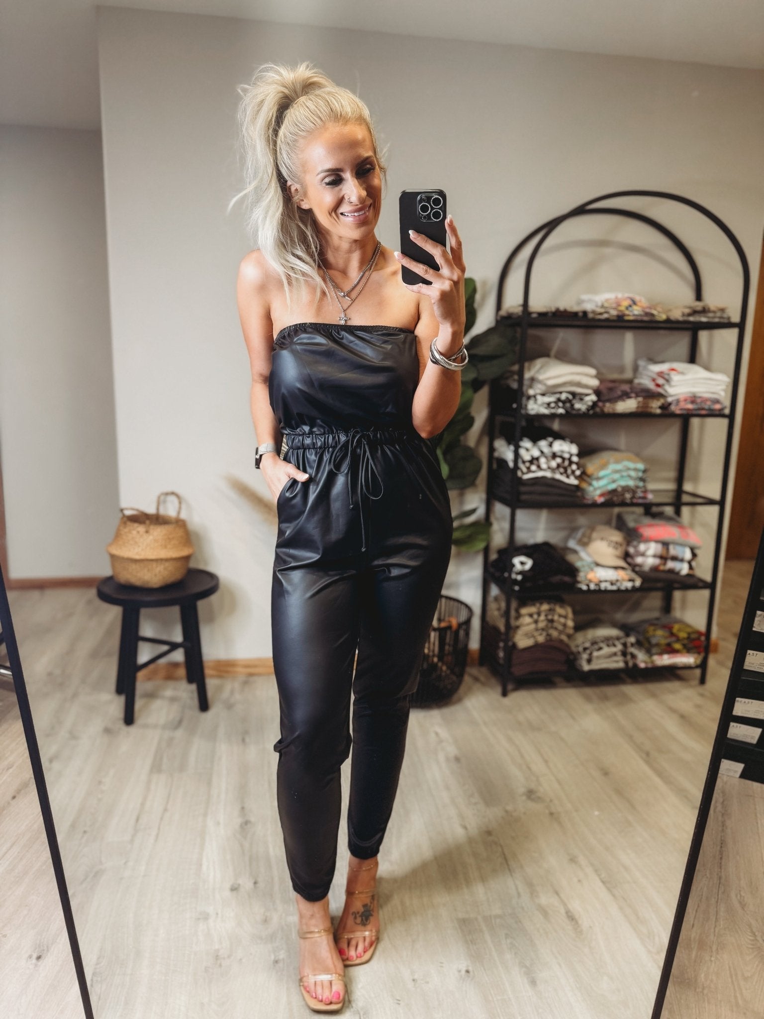 Get ready to turn heads with the Hagen Leather Jumpsuit. This trendy piece boasts a stretchy fit and convenient pockets, making it both stylish and functional. Say goodbye to boring outfits and hello to fashion-forward flair. (Jumpsuit, but make it fashion!)