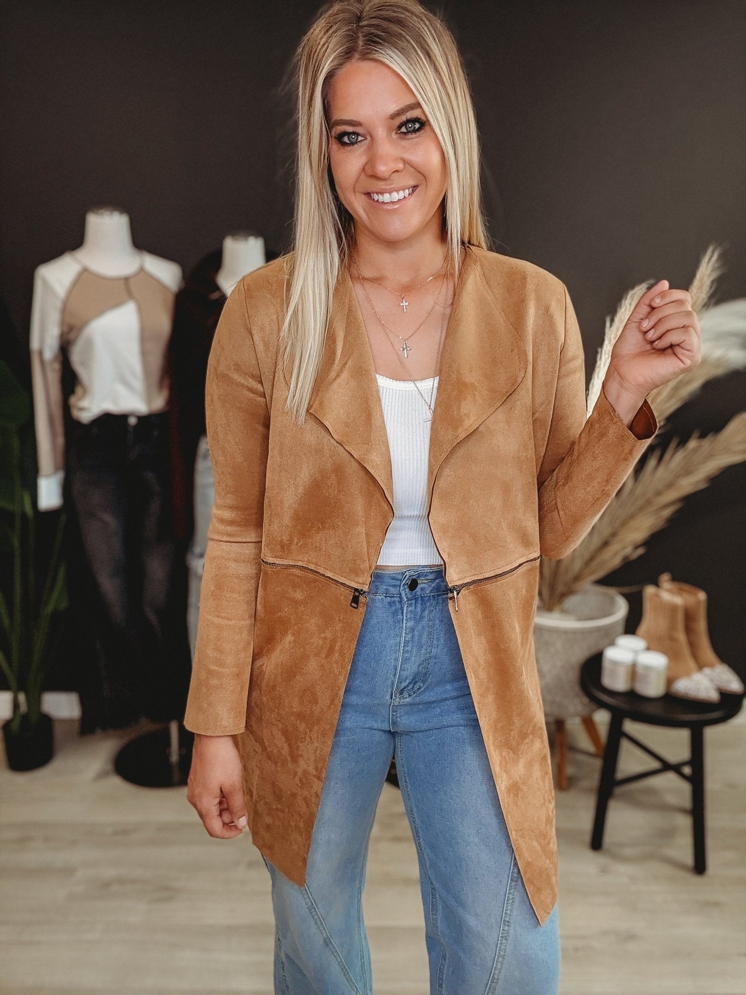 Meet your new season staple: the Medina Suede Jacket. With its soft suede texture and flawless fit, it’s perfect for adding a touch of cool to any outfit. Whether layered over a cozy sweater or styled with your favorite jeans, this jacket keeps you effortlessly on point and ready for anything the season throws your way.