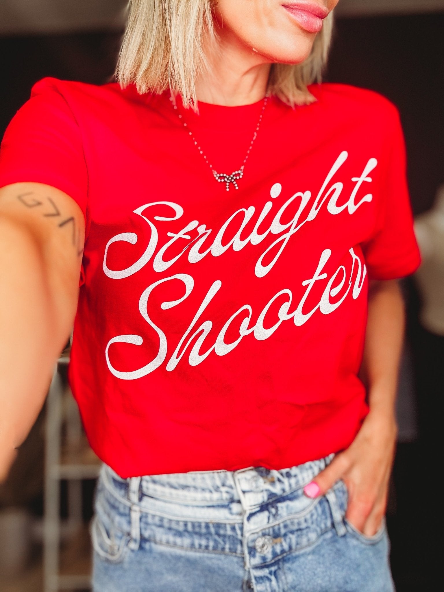 Yeehaw! Get ready to ride with our Straight Shooter Graphic Tee. This tee features a trendy cowgirl era design, perfect for any fun-loving fashionista. Saddle up and show off your playful side with this quirky and stylish shirt. (Giddyup and get yours today!)