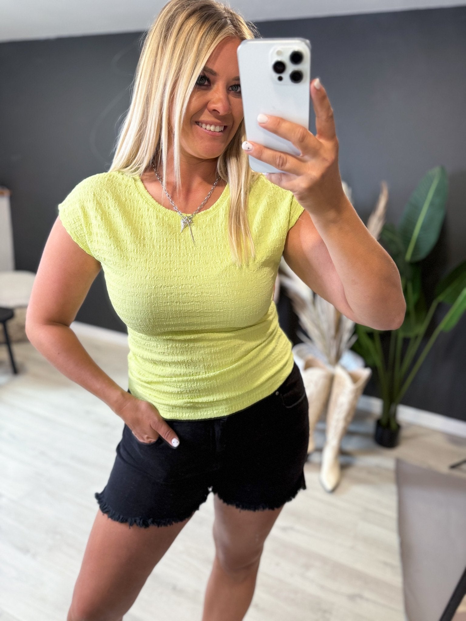 Add a splash of sunshine to your wardrobe with The Lemon Lime Crinkled Top. Its vibrant, zesty color is perfect for those who love to stand out and brighten any room. The unique crinkled texture adds a fun, tactile dimension that feels as lively as it looks. This playful top is your go-to for effortless style with a cheerful twist.