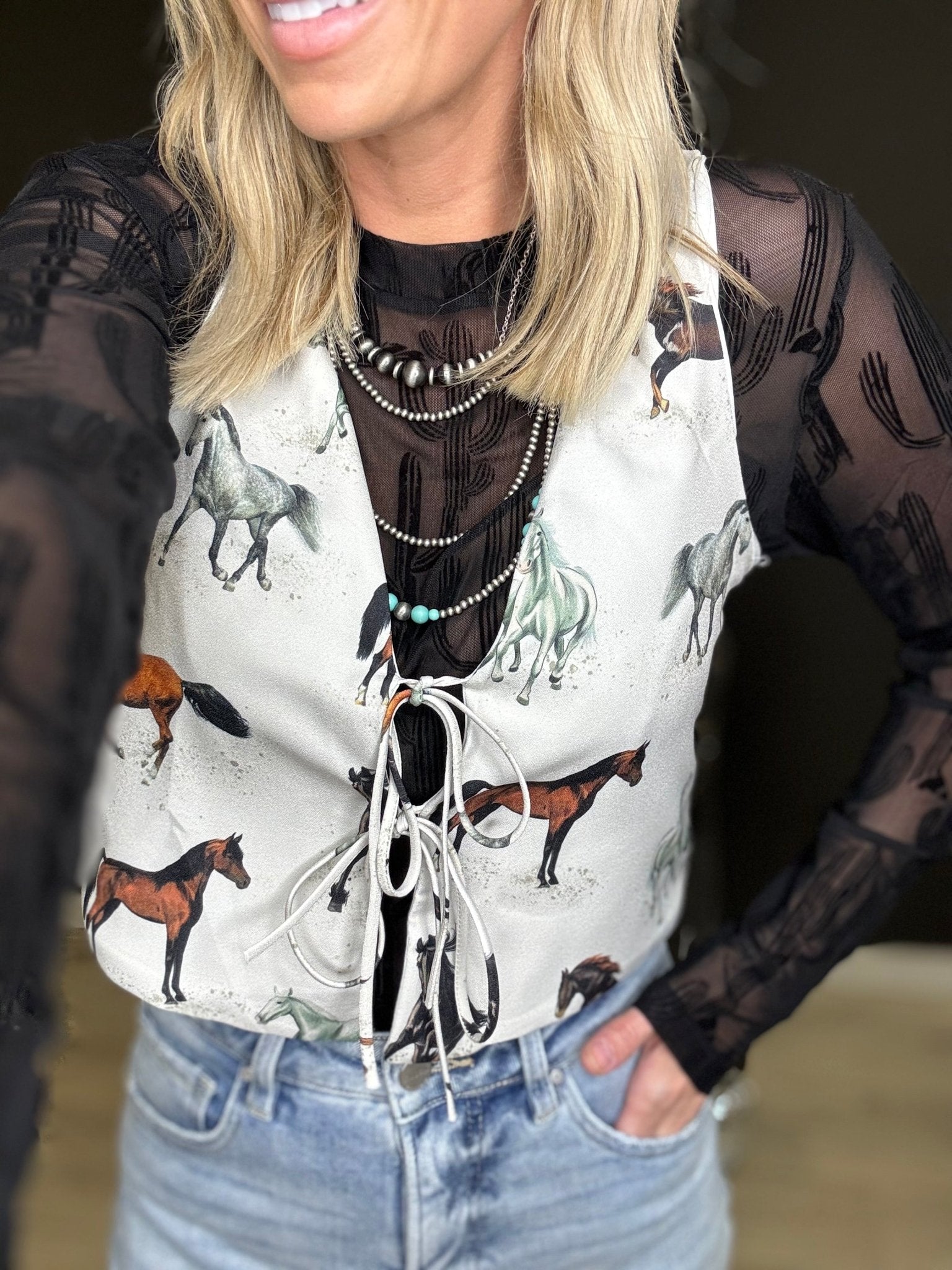 Get ready for a wild night out with the Veda Tie Front Vest! This western chic vest brings a touch of boho flair to any outfit, making it perfect for girls night. Say "howdy" to your new go-to layering piece!