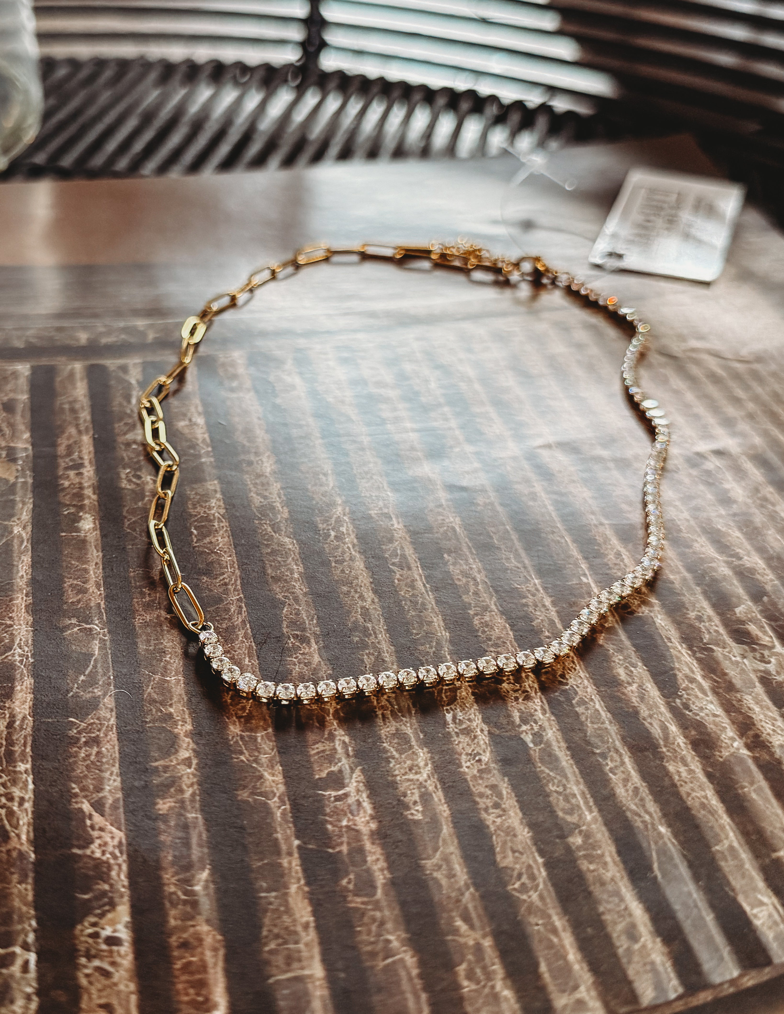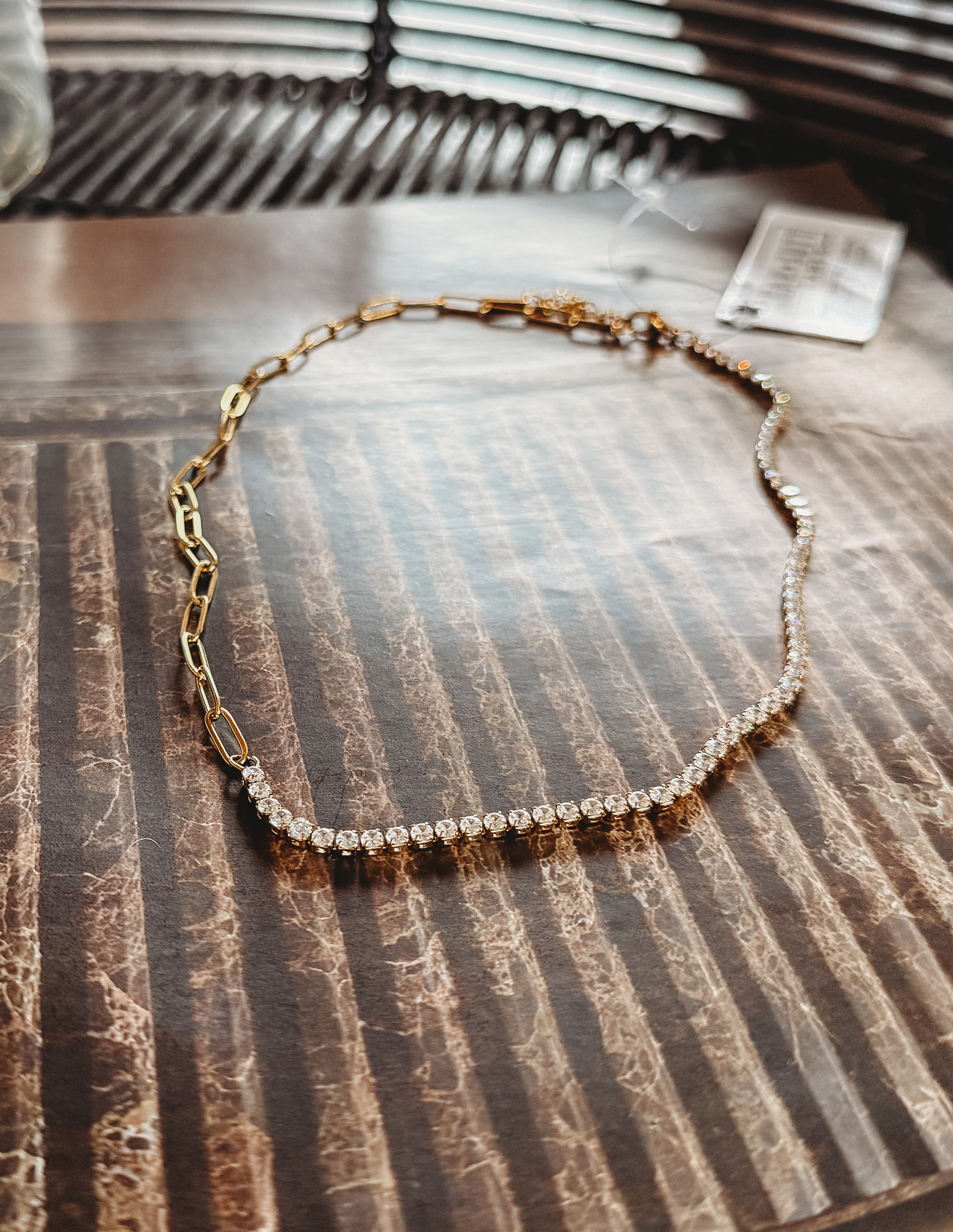 Add a sparkling twist to any outfit with the Chaney Chane Crystal Studded Necklace. Its shimmering crystals make it perfect for layering, adding just the right amount of sparkle without stealing the show. Whether worn alone or stacked with your favorite chains, this necklace brings a playful shine to your everyday style.