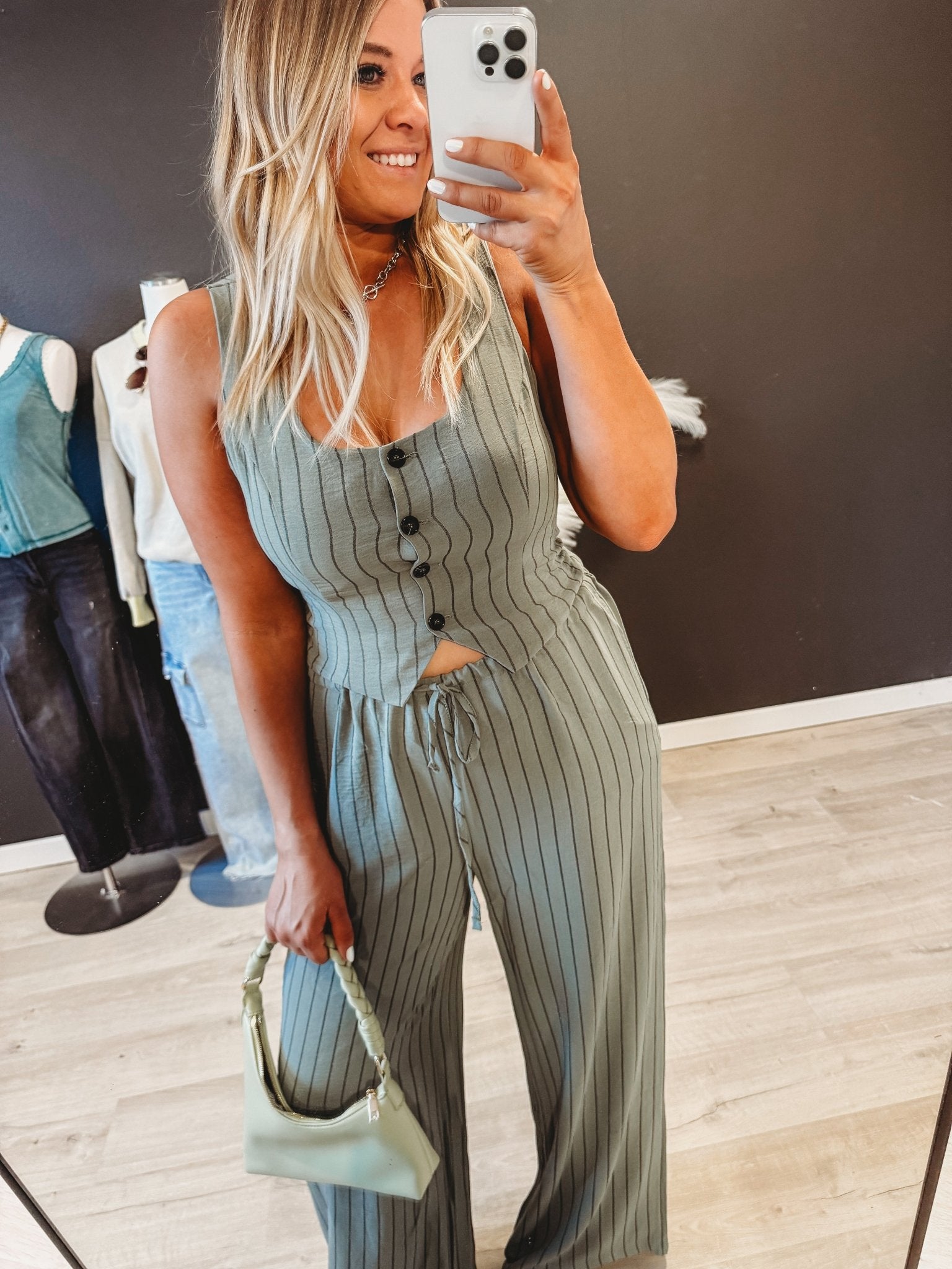 Embrace effortless bohemian style with this versatile two-piece set. The structured button-up vest features classic pinstripes for a polished look, while the full-length pants offer comfort with a stretchy waistband and adjustable tie closure. Perfect for layering or wearing as a complete outfit, this set transitions seamlessly from casual days to evening occasions. The relaxed fit and breathable fabric make it ideal for warm weather wear, while the neutral tones pair easily with your existing wardrobe.